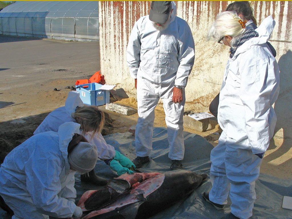 Deuxième protocole : lorsque l’animal est assez frais, il nous est possible de réaliser des prélèvements de muscles, du foie, des reins, du lard, de l’estomac entier, et des gonades (testicules ou ovaires). Le tout est ensuite mis au congélateur avant d’être pris en charge par le centre de recherche de La Rochelle (Pélagis).